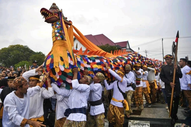 Ritual Mengulur Naga menjadi puncak kemeriahan sekaligus momen sakral dalam penutupan Erau Adat Kutai 2025 di Tenggarong, Kalimantan Timur, Minggu (28/09/2025).