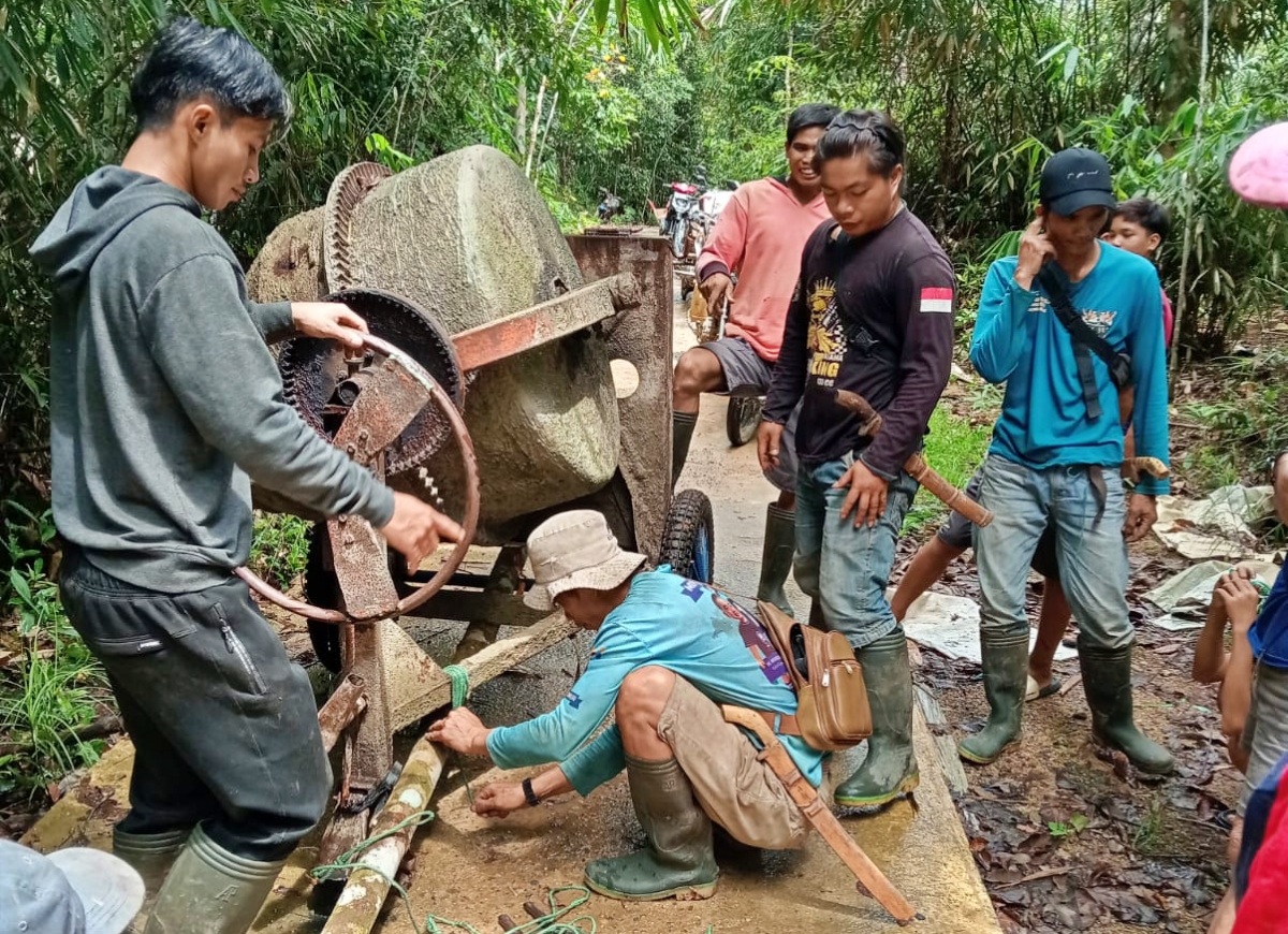 Warga pun tak tinggal diam. Mereka bergotong royong memperkuat pondasi dengan batu sungai dan menambal jalan rusak menggunakan alat seadanya.