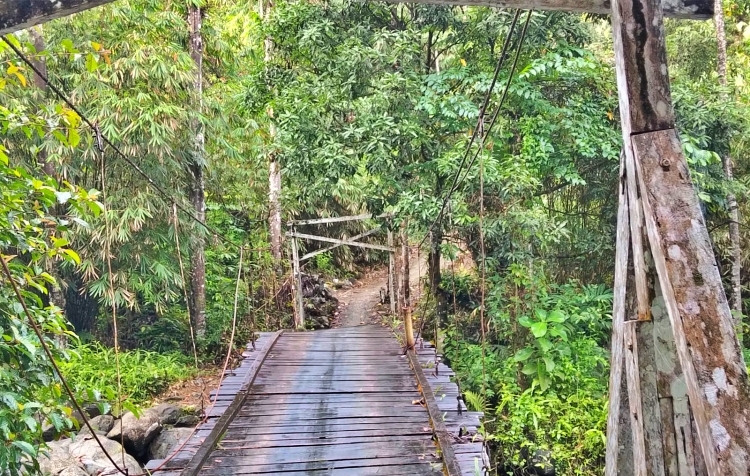 Jalan berbatu, sebagian tergerus longsor, dan dua jembatan gantung yang mulai miring menjadi ujian sebelum sampai di surga air terjun.