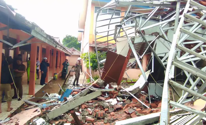 Saksi mata, Yudi Santosa, menjelaskan bahwa pohon besar di halaman sekolah roboh dan menimpa salah satu ruang kelas hingga menyebabkan rangka baja ringan di ruangan lain ikut ambruk.
